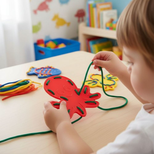 - Розвиток дрібної моторики і координації: маніпулювання шнурівкою через отвори фігурок тварин сприяє розвитку моторики пальців, кисті та зап’ястя — що створює основу для графомоторики та письма.