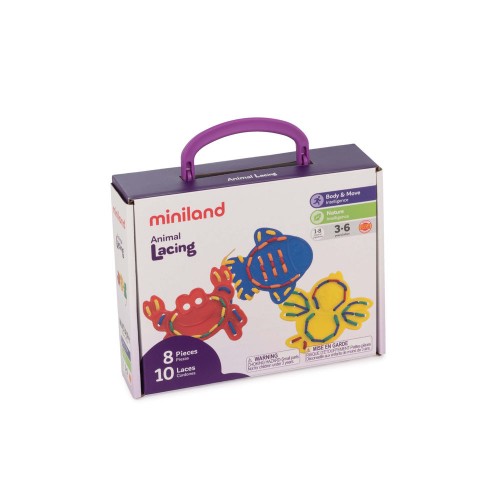 Набір «Animal Lacing» Miniland Educational — це високоякісний дидактичний матеріал, призначений для формування й удосконалення дрібної моторики, координації рухів, сенсорно-моторних навичок та мовно-когнітивного розвитку дітей 3-6 років. Включає в себе 8 фігурок тварин та 1 метр шнурівки; фігурки також можуть використовуватись як трафарети для малювання та розмальовки.